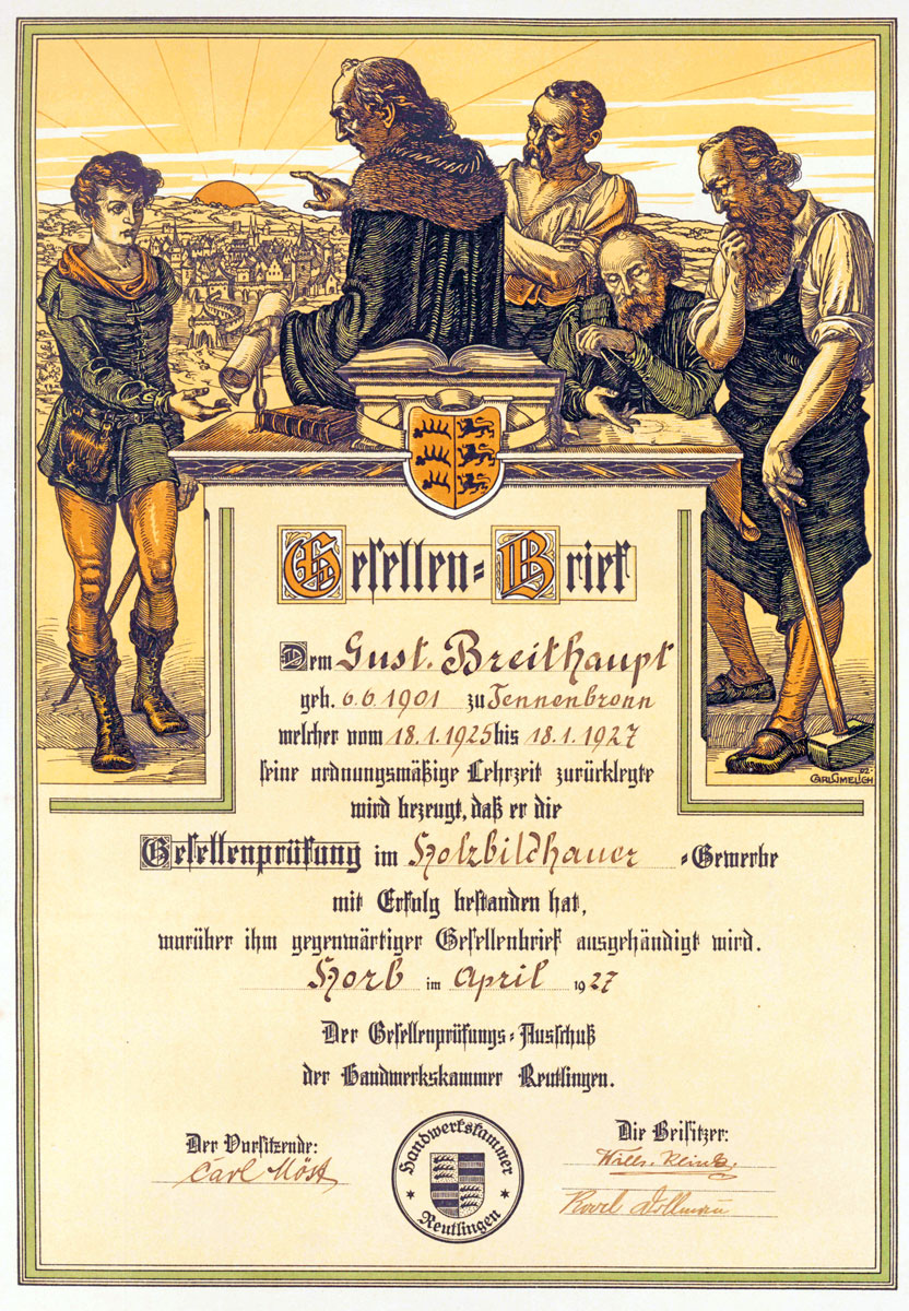 Ein Gesellenbrief eines Holzbildhauers aus dem Jahre 1927 erinnert daran, dass es eine Vielfalt an handwerklichen Lehrberufen gab.