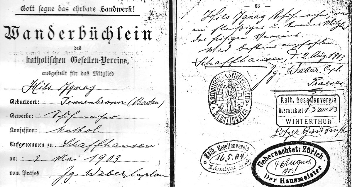 Als Geselle ging man dann auf die Walz. Das Wanderbüchlein des Schuhmachers Ignaz Hils von 1903 zeigt dessen Stationen in Süddeutschland, Österreich und der Schweiz.