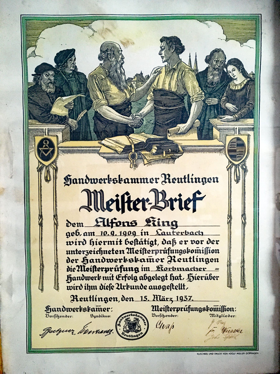 Ein Meisterbrief eines Korbmachers aus dem Jahre 1937 ist ebenfalls Zeugnis eines heute fast ausgestorbenen Berufs.