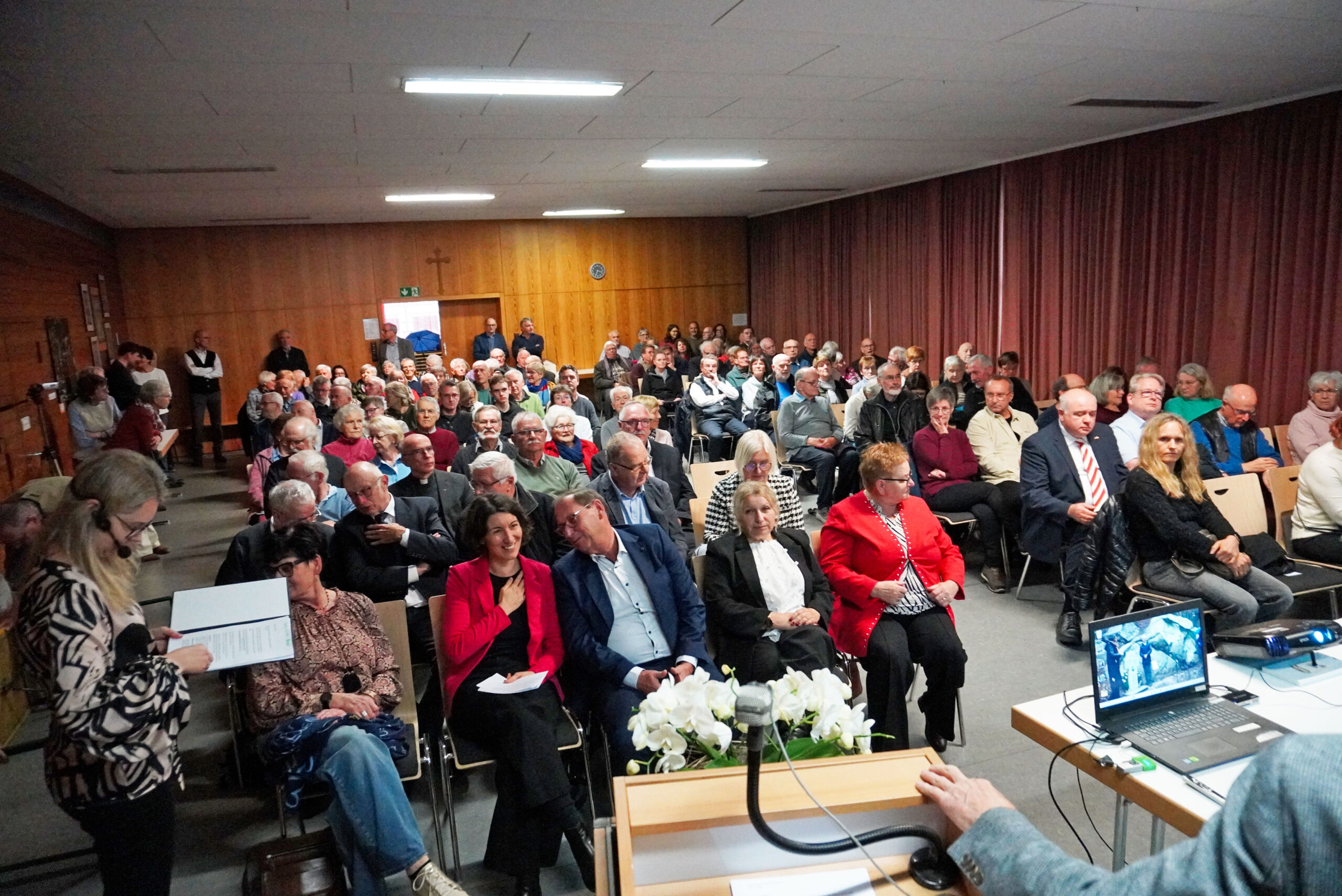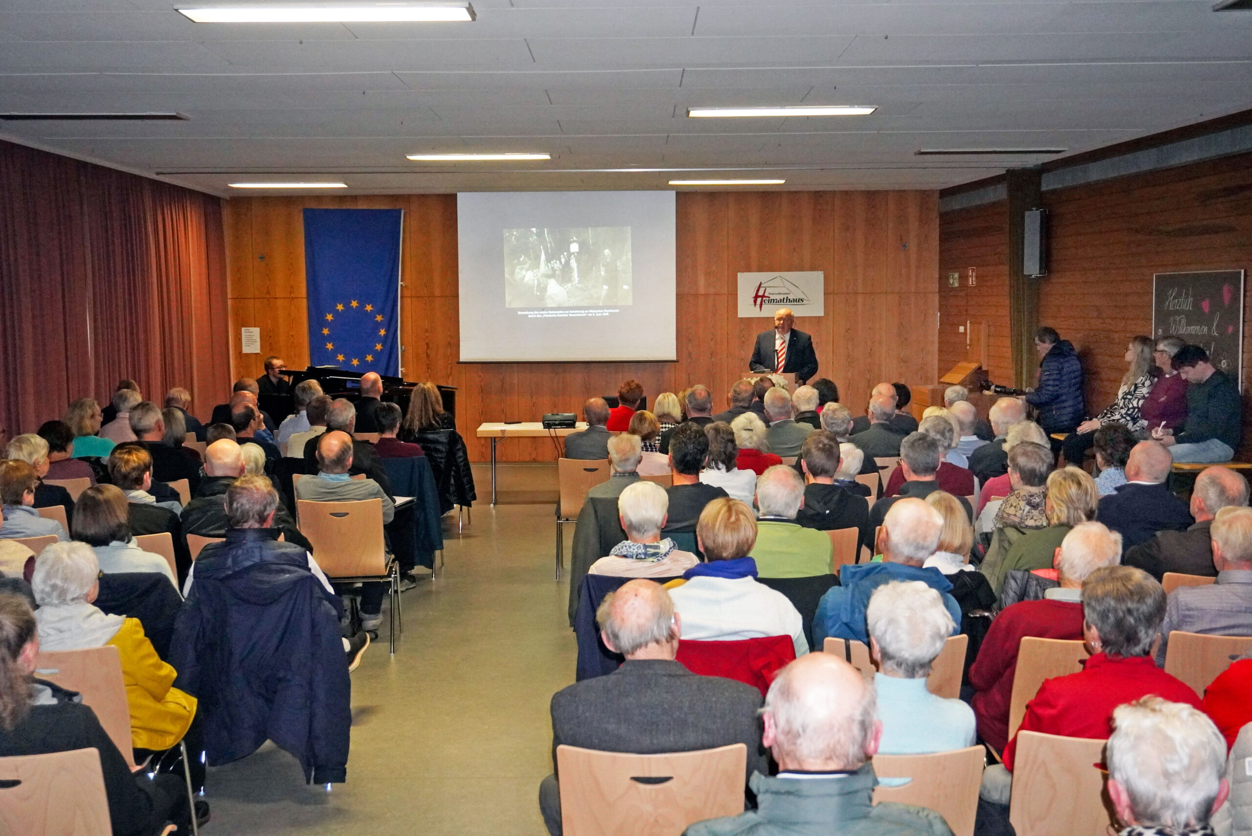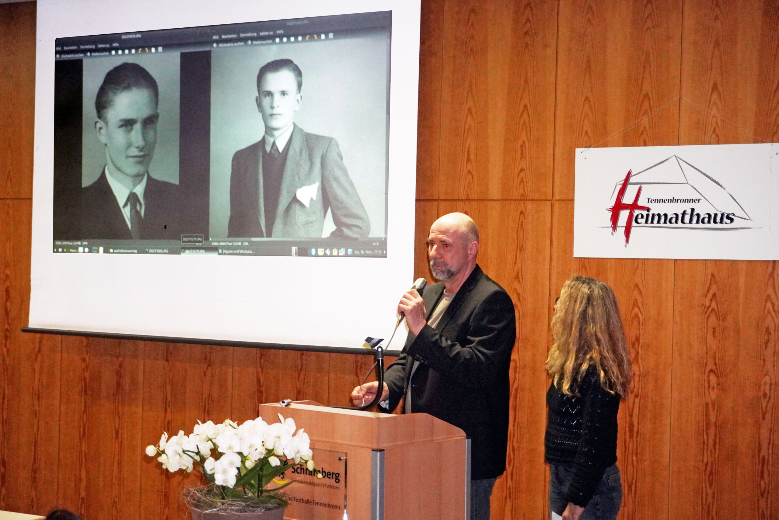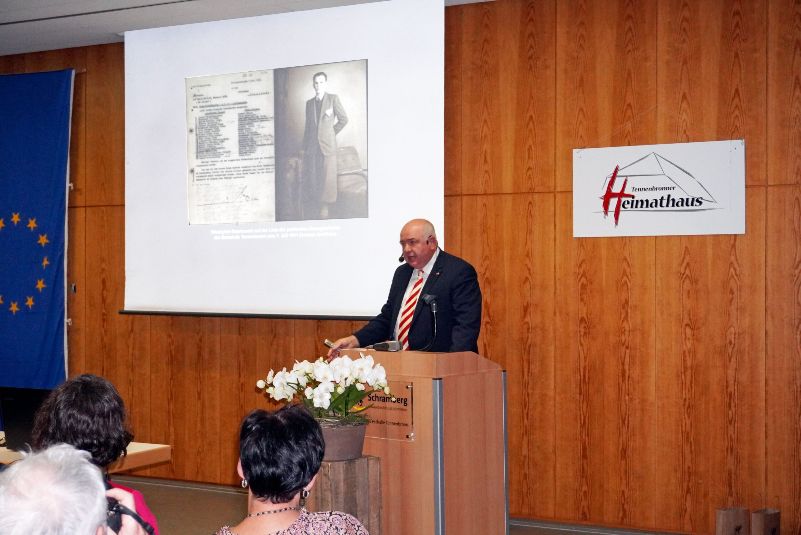 Die schon zahlreichen Gäste bei der am entlegenen Langenberg stattgefundenen Kreuzenthüllung trafen sich anschließend im katholischen Pfarrsaal, welcher mit über 120 Besuchern bis auf den letzten Platz gefüllt war. In einem nahezu einstündigen Vortrag präsentierte Stadtarchivar Carsten Kohlmann die Resultate seines Forschungsprojekts, das er als noch nicht abgeschlossen bezeichnete. Nicht nur zum Schicksal des hingerichteten Polen, sondern auch zum Leidensweg seiner Geliebten Agnes Kunz und deren Familie fand er erschütternde Dokumente und Informationen. Die junge Mutter durchlebte die Konzentrationslager Ravensbrück und Uckermark und sah den Vater ihres Kindes nie wieder. Doch auch auf die Spuren der Täter von damals war Kohlmann gestoßen. Er konnte die Befehlskette nachvollziehen und mit konkreten Namen benennen, an leitender Stelle auch ein gebürtiger Schramberger.