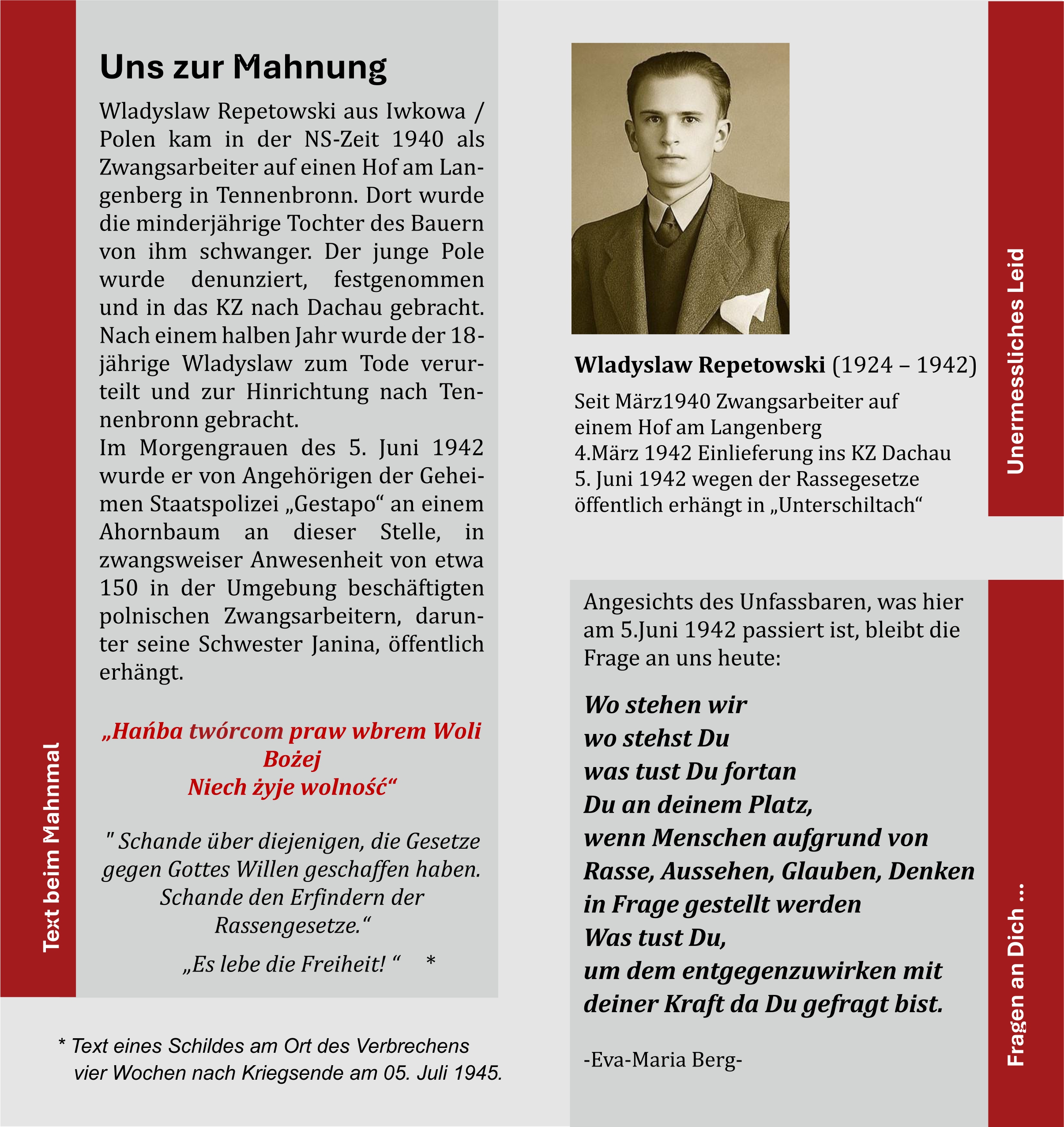 ein neues Mahnmal zur Erinnerung an den in Tennenbronn erhängten polnischen Zwangsarbeiter Wladyslaw Repetowski enthüllt.