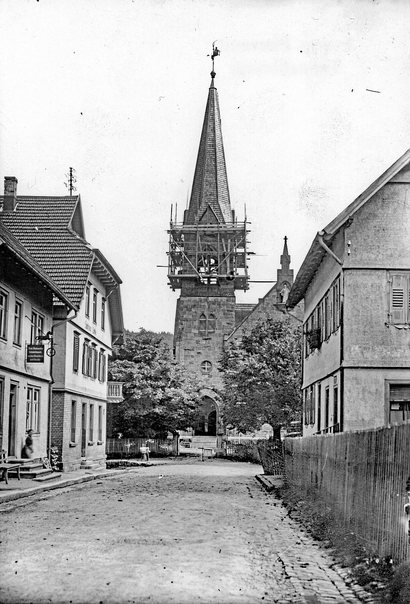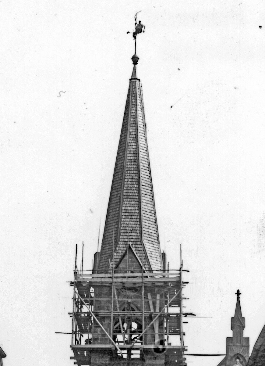 Der alte Gockel war in den 1950er Jahren abgerostet und heruntergefallen. Johann Georg Grießhaber hat sich um Ersatz gekümmert. Der Gockel wurde in der Firma Schneider aus Aluminium ausgeschnitten. Der vordere Teil ist stärker vom Material, damit Gleichgewicht herrscht. Bei der Firma Junghans wurde er eloxiert. Es war vermutlich 1956.